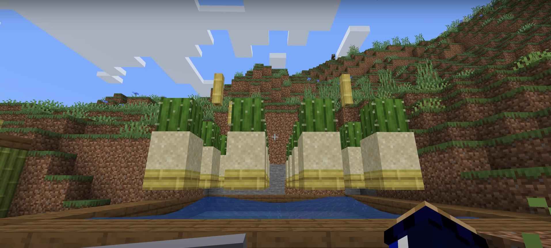 - You would see that all the water flows down to one central block. This is the place you have to place the hopper to collect all of the cactus yield that will fall into the water.